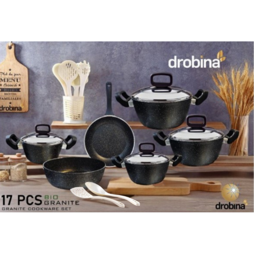 طقم قدور من دروبينا مصنوع من الغرانيت عالي الجودة, طقم قدور متكامل لجميع احتياجات الطبخ الخاصة به, القاعدة السفلية تجعل أواني الطهي متينة وتسخن بسرعة وبشكل متساوي, غطاء ستيل محكم الإغلاق.