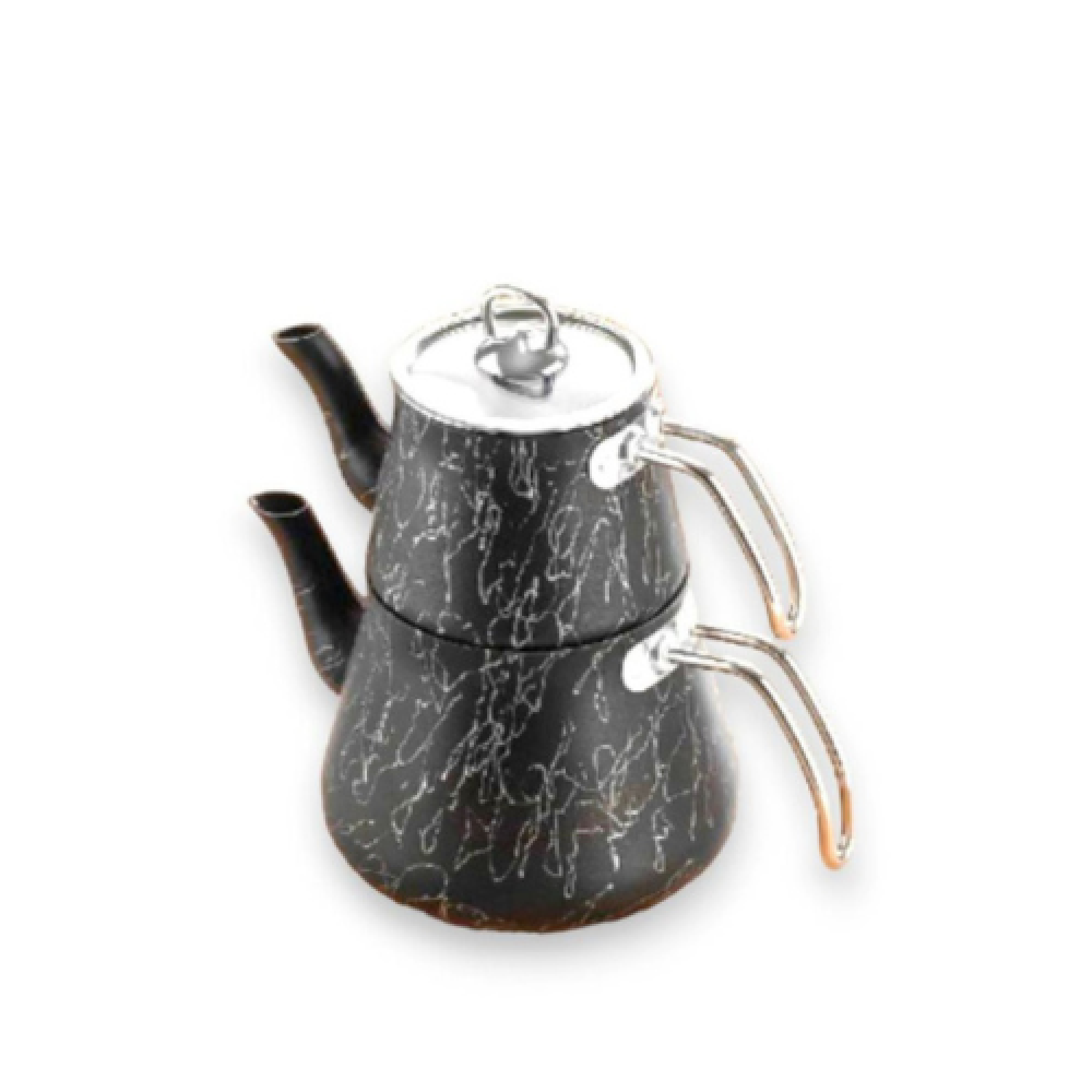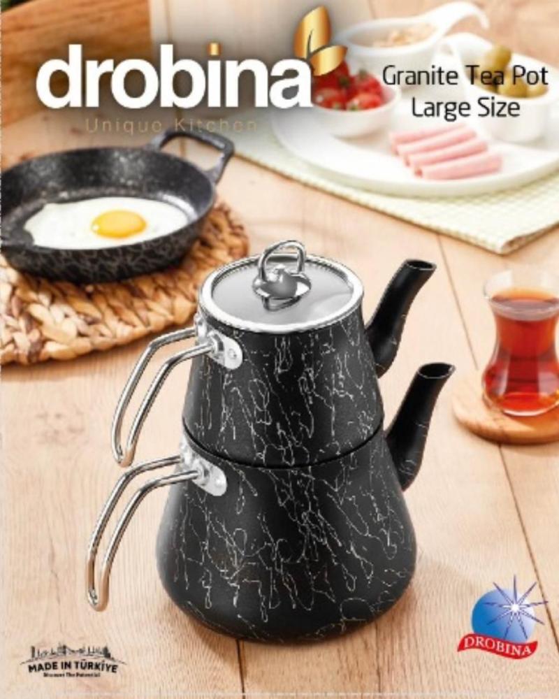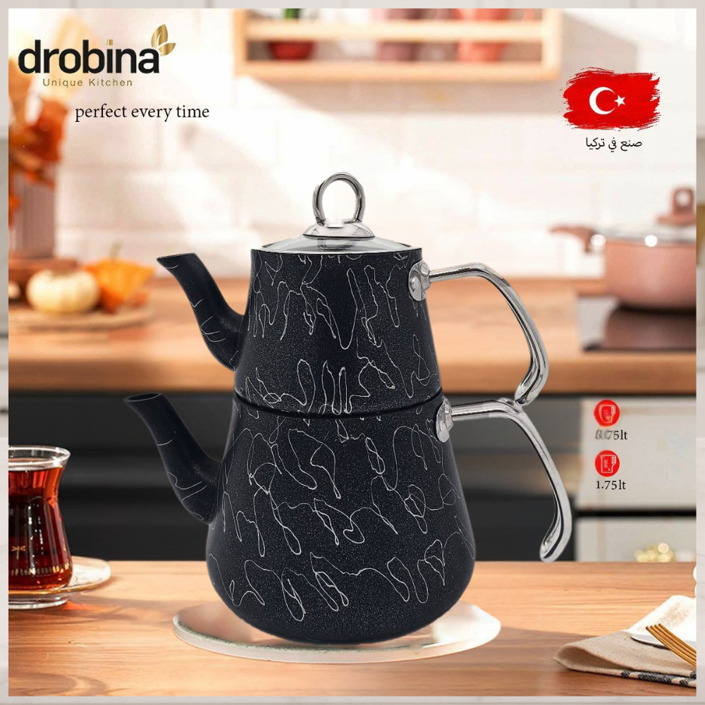 إبريق شاي لن تراه في كل مطبخ من دروبينا مع نقش فضي على الجرانيت الاسود , المقبض مصنوع من الفولاذ المقاوم للصدأ ولا يسخن إلا إذا حملته مباشرة فوق النار، لذلك فهو مريح جدًا في الاستخدام. مادة الغطاء: زجاج آمن للاستخدام في غسالة الأطباق متوافق مع مواقد الغاز والكهرباء، مقبض من الستانلس ستيل