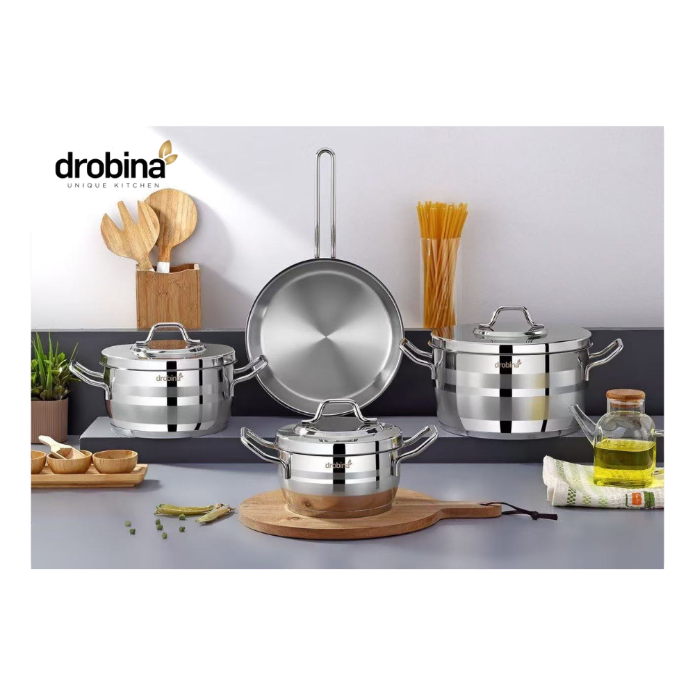 طقم قدور من دروبينا مصنوع من أجود أنواع ستانلس ستيل, يتميز بالمتانة والصلابة التي تساهم بحصولك على قدر مميز ويدوم طويلا, القدور مجهزة بأغطية مصنوعة من الستانلس ستيل, وهذا يجعل الحرارة تنعكس إلى داخل الآنية, مما يجعل محتوياتها تغلي بشكل أسرع وبالتالي يقل استهلاك الطاقة, القدور مستديرة من الداخل مما يسهل عملية التقليب والتحريك.