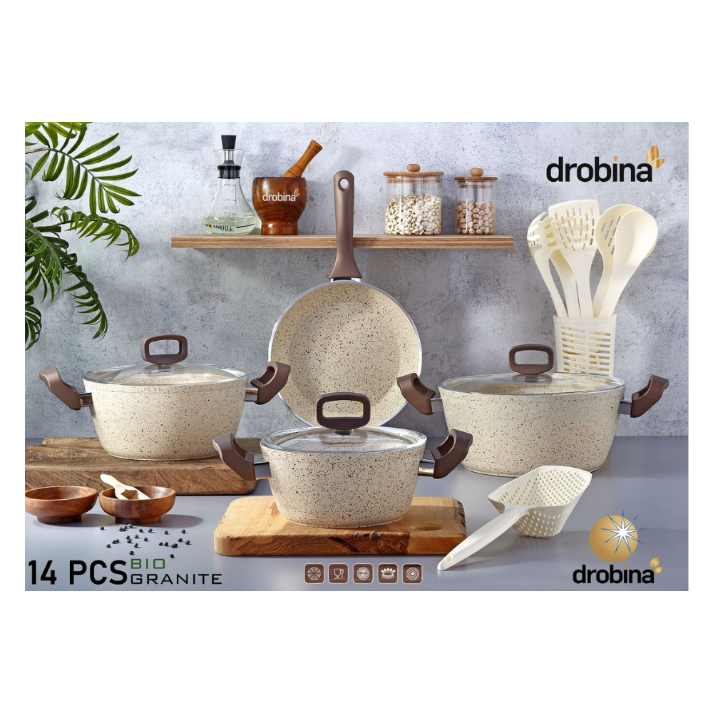 طقم قدور من دروبينا مصنوع من الغرانيت عالي الجودة, طقم قدور متكامل لجميع احتياجات الطبخ الخاصة به, القاعدة السفلية تجعل أواني الطهي متينة وتسخن بسرعة وبشكل متساوي