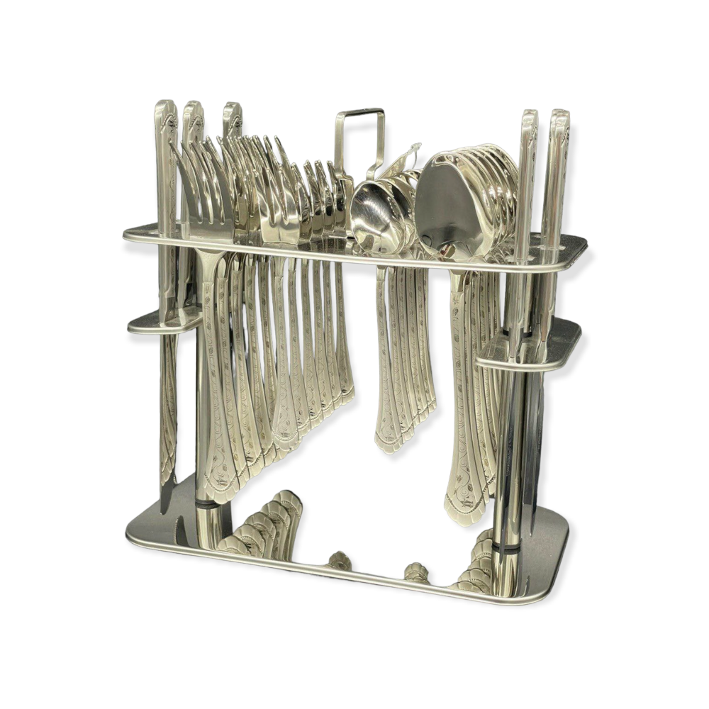 طقم ملاعق من دروبينا مصنوع من الستانلس ستيل الفاخر, مثالي للتقديم والاستعمال اليومي, مُصممةٌ بنمط عصري وعملي لتلبية احتياجاتك المختلفة في جميع الأوقات, مجموعة رائعة مكونة من 30 قطعة مع ستاند ستانلس ستيل بمقبض لسهولة الحمل.