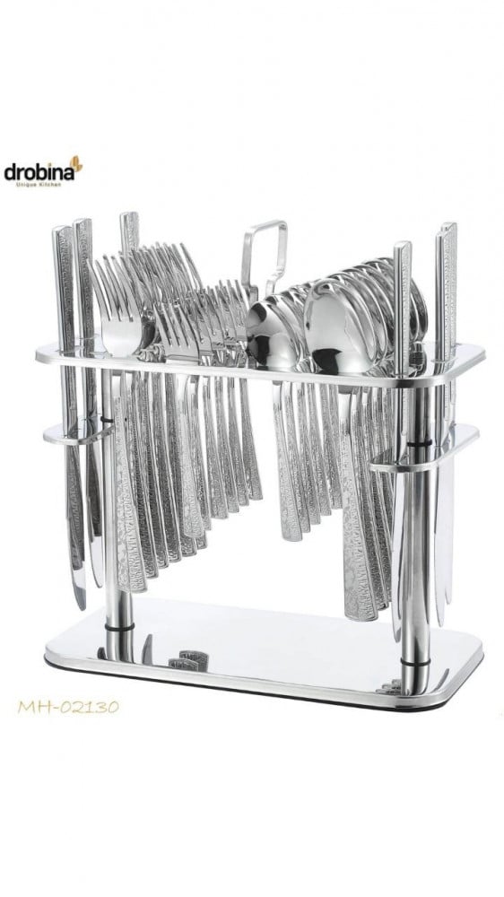 طقم ملاعق من دروبينا مصنوع من الستانلس ستيل الفاخر, مثالي للتقديم والاستعمال اليومي, مُصممةٌ بنمط عصري وعملي لتلبية احتياجاتك المختلفة في جميع الأوقات, مجموعة رائعة مكونة من 30 قطعة مع ستاند ستانلس ستيل بمقبض لسهولة الحمل.