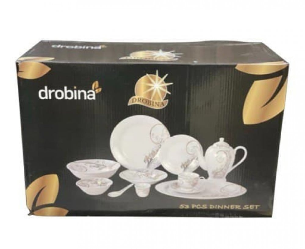 تجهيزات الولائم لا تكتمل إلا بطقم سفرة المميز والجذاب من دروبينا, طقم خزفي فاخر و عالي الجودة, أحجام مختلفة ومتنوعة لتلبي جميع احتياجات تقديمك, تصميم فخم بلون أبيض و زخرفة فاخرة وخطوط بلون ذهبي على الأطراف, يزيد جمال سفرتك ومناسباتك بصناعته الاحترافية والمتقنة, طقم دروبينا مكون من 53 قطعة متكاملة ومتنوعة
