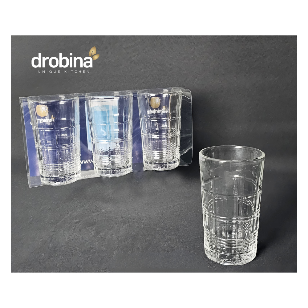 طقم كاسات عصير من دروبينا مصنوع من زجاج كريستال شفاف عالي الجودة، مما يضمن المتانة وتجربة شرب فائقة.