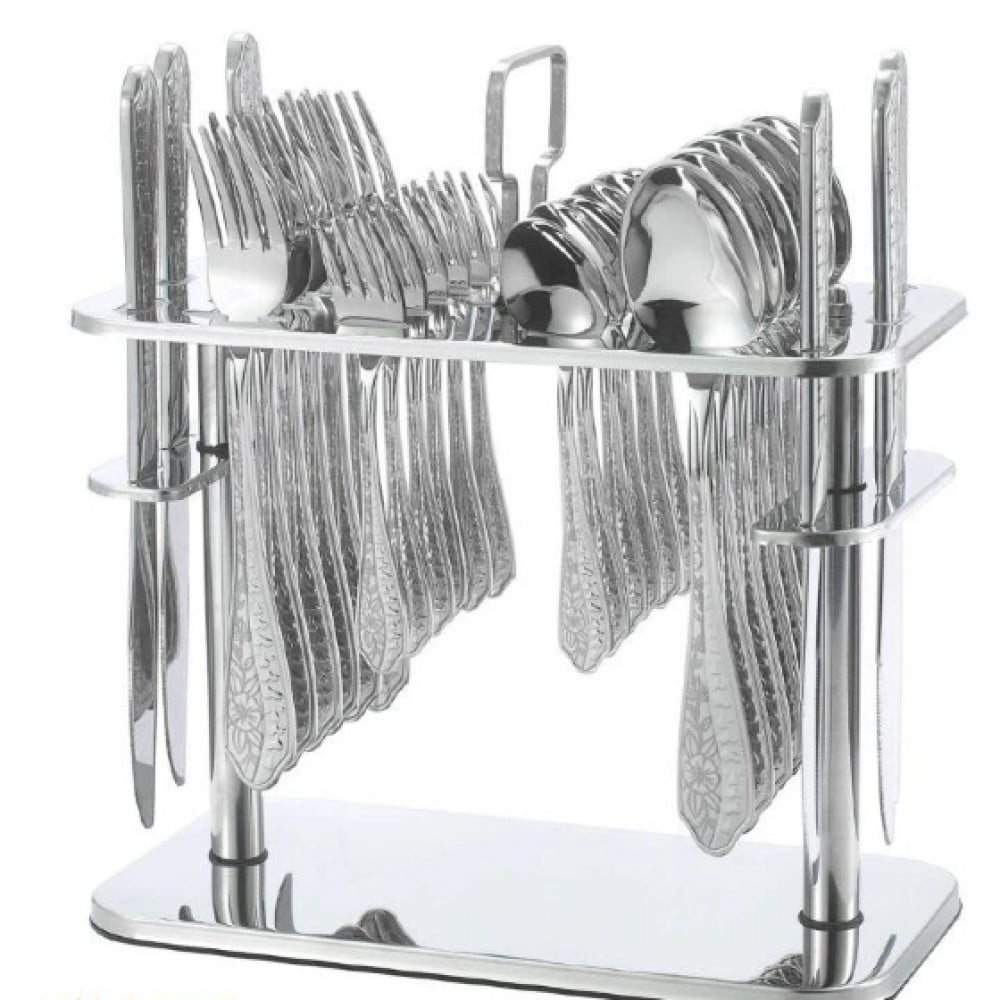 طقم ملاعق من دروبينا مصنوع من الستانلس ستيل الفاخر, مثالي للتقديم والاستعمال اليومي, مُصممةٌ بنمط عصري وعملي لتلبية احتياجاتك المختلفة في جميع الأوقات, مجموعة رائعة مكونة من 30 قطعة مع ستاند ستانلس ستيل بمقبض لسهولة الحمل.